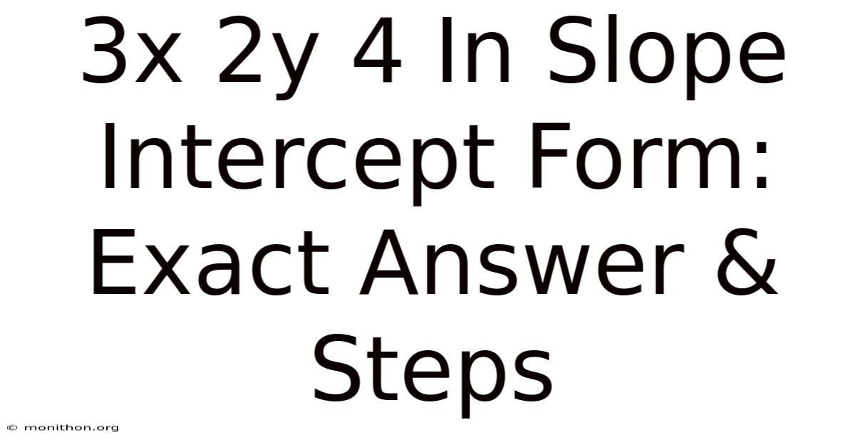 If you’ve ever typed 3x 2y 4 in slope intercept form into a search bar at 11 PM, you’re in good company. But whether you typed it fast, copied it from a crumpled worksheet, or just heard a teacher say it out loud, the goal is exactly the same. Practically speaking, you want to untangle that equation, get y by itself, and finally see what the line is actually doing. So most textbooks slap a plus sign in there: 3x + 2y = 4. Turns out, this one algebra move unlocks a lot more than just a homework problem It's one of those things that adds up..