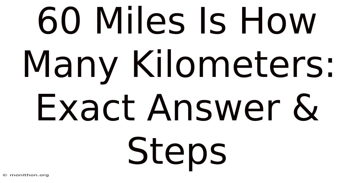 Q: How many kilometers are in 60 miles? A: Precisely, 60 miles is 96.5606 kilometers. For everyday use, rounding to 97 km or 96.5 km is perfectly acceptable, depending on the required precision Not complicated — just consistent..