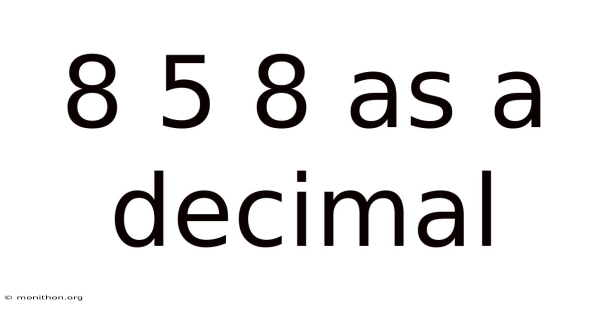 The expression "8 5 8" can be interpreted in different ways depending on the context. In this article, we will explore how to convert "8 5 8" into a decimal format and understand the mathematical reasoning behind it. Whether you're a student, teacher, or just curious about numbers, this guide will provide you with a clear and detailed explanation.