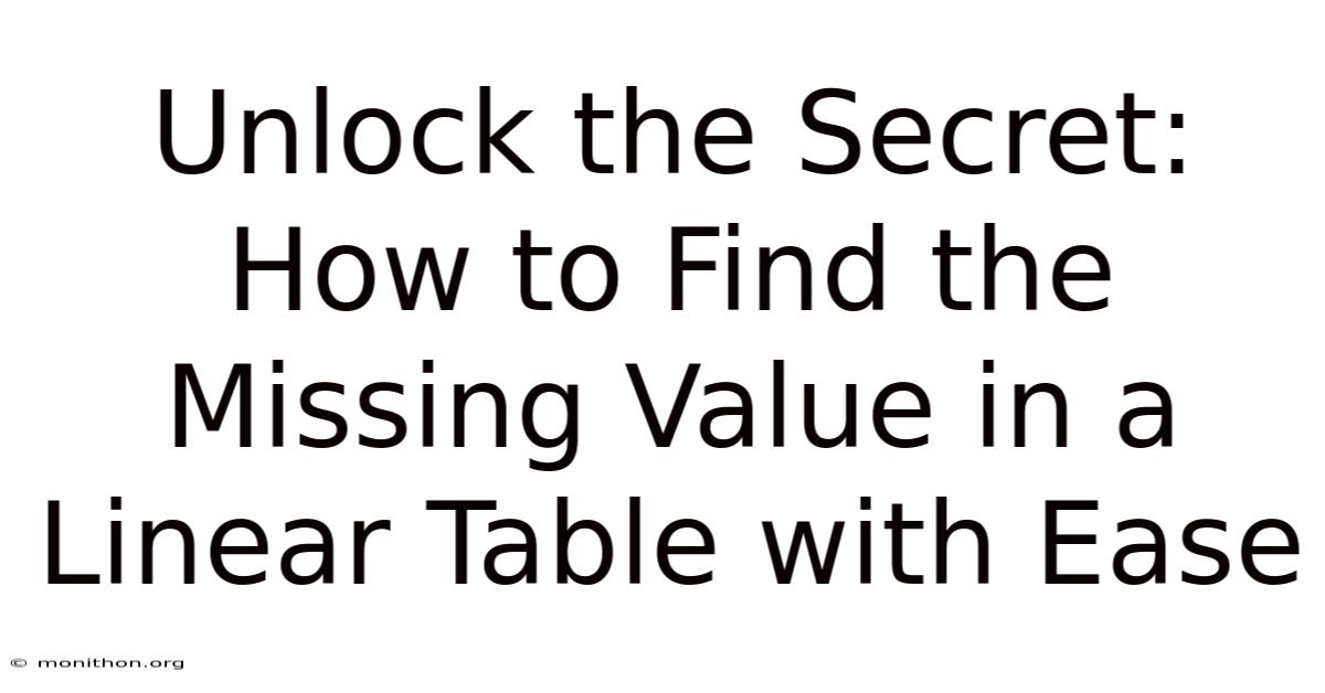 Ever stared at a table of numbers with one blank spot and wondered, “How do I fill this in without guessing?If you’ve ever dealt with a table where one number is missing, you’re not alone. ” Maybe you’re working on a math problem, analyzing data, or just trying to make sense of a spreadsheet. And the good news? The good news is that finding a missing value in a linear table isn’t some magical trick—it’s a straightforward process rooted in patterns and consistency. You don’t need a calculator or a degree in algebra to figure it out.