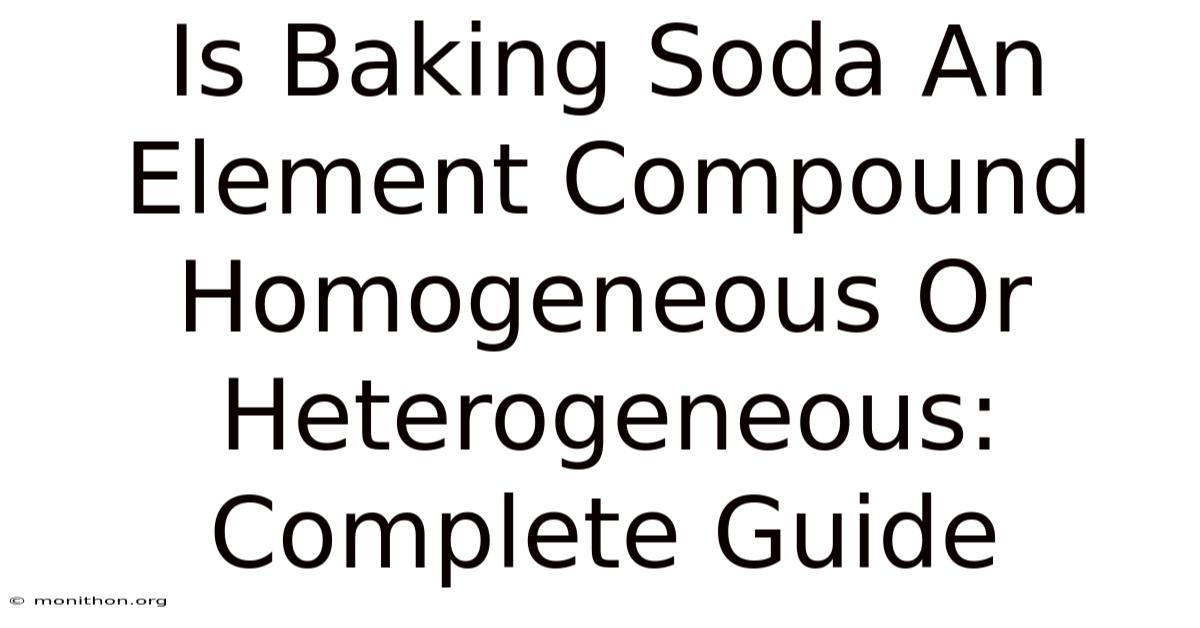 You’re standing in the kitchen, box of baking soda in hand, and suddenly a middle school science question pops into your head: is baking soda an element compound homogeneous or heterogeneous? Think about it: it’s not a dumb question. Here's the thing — honestly, it’s one of those things that sounds straightforward until you actually try to pin it down. I’ve seen it trip up students, home bakers, and even DIY cleaning enthusiasts. But that answer only scratches the surface. Think about it: the short version is that baking soda is a compound, and in its pure form, it’s homogeneous. Let’s actually unpack it The details matter here..
