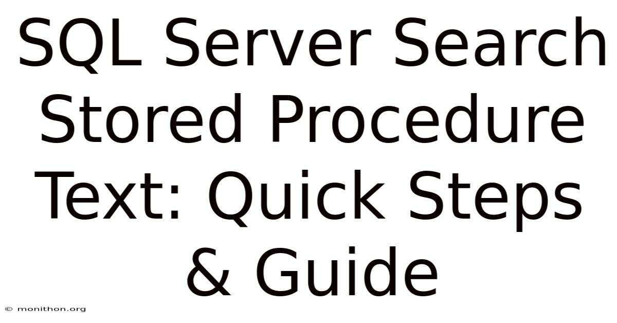 Searching for specific text inside storedprocedures is a common task for database administrators and developers who need to locate logic, troubleshoot issues, or perform impact analysis in SQL Server environments. The ability to quickly scan the definition of routines such as procedures, functions, and triggers saves time and reduces the risk of missing critical code during changes. This article explains various techniques to search stored procedure text, discusses their strengths and weaknesses, and offers best‑practice guidelines to make the process efficient and reliable Simple, but easy to overlook. Nothing fancy..